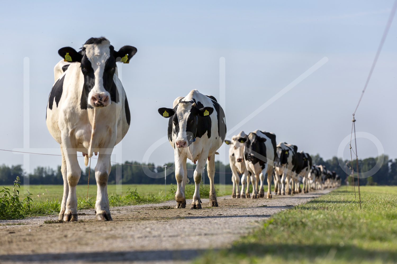 Zwartbonte koeien op weg naar de melkstal om gemolken te worden.