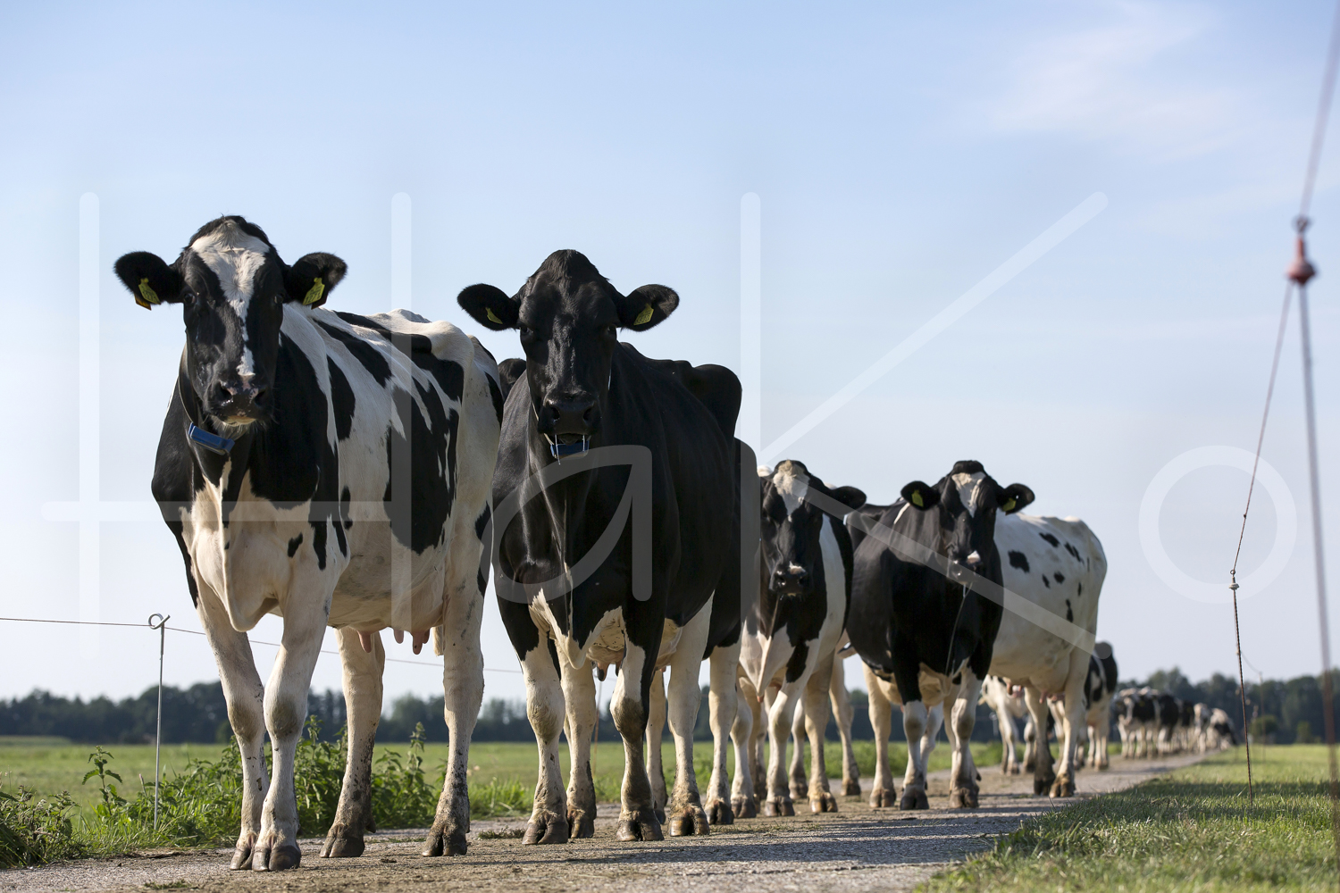 Zwartbonte koeien op weg naar de melkstal om gemolken te worden.