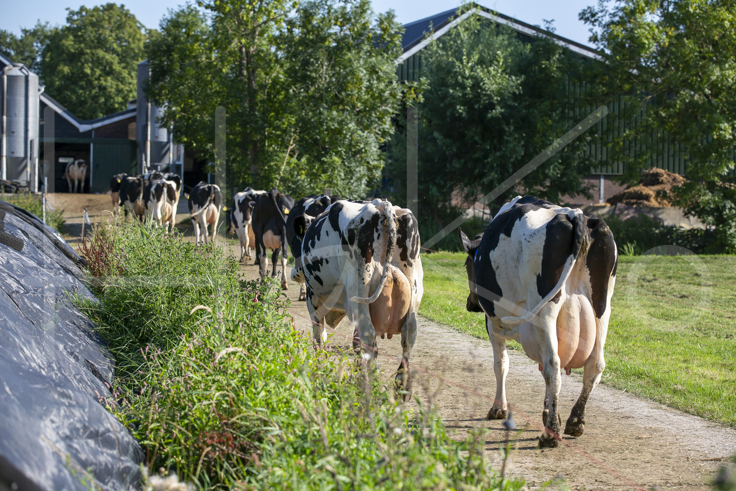 Zwartbonte koeien op weg naar de melkstal om gemolken te worden.