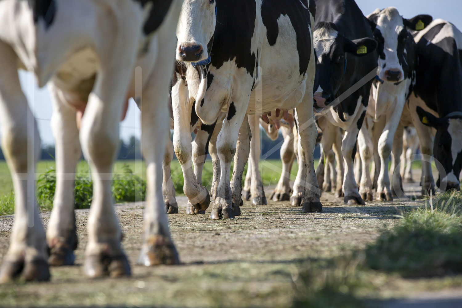 Zwartbonte koeien op weg naar de melkstal om gemolken te worden.