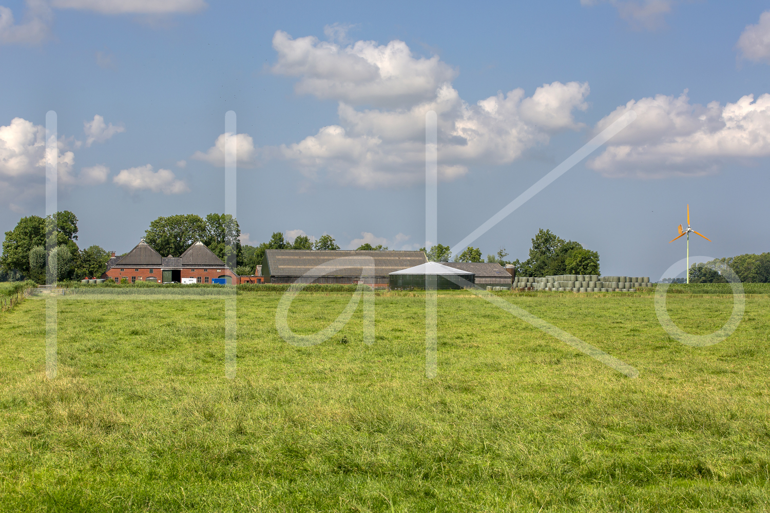 Boerderij met windmolen in het landschap.