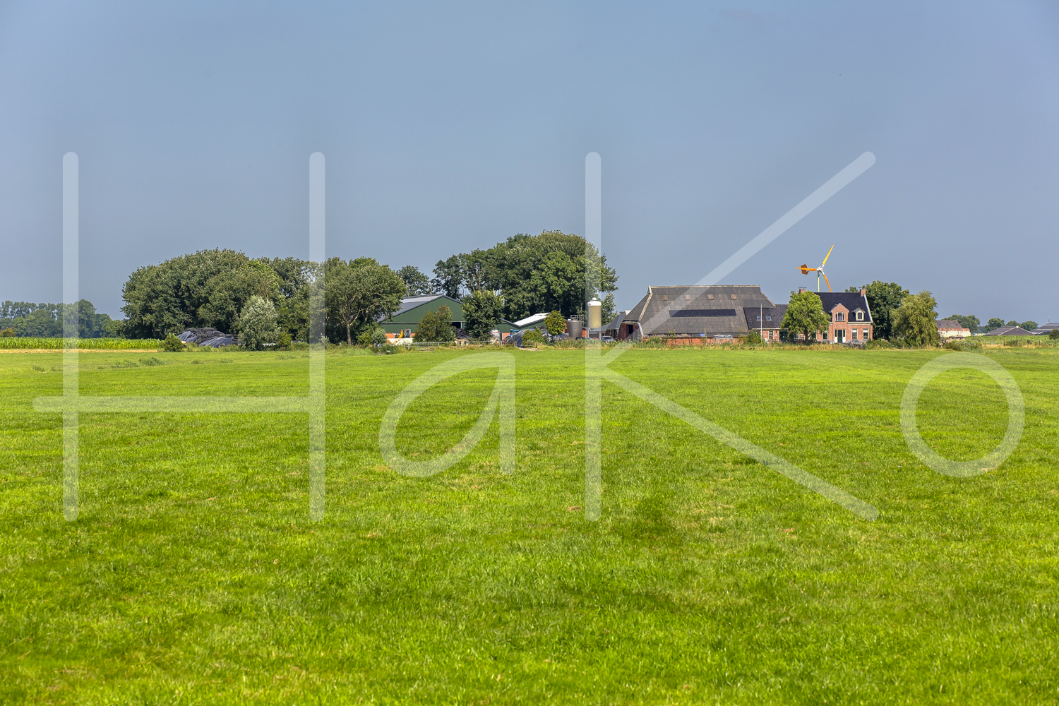 Boerderij met windmolen in het landschap.