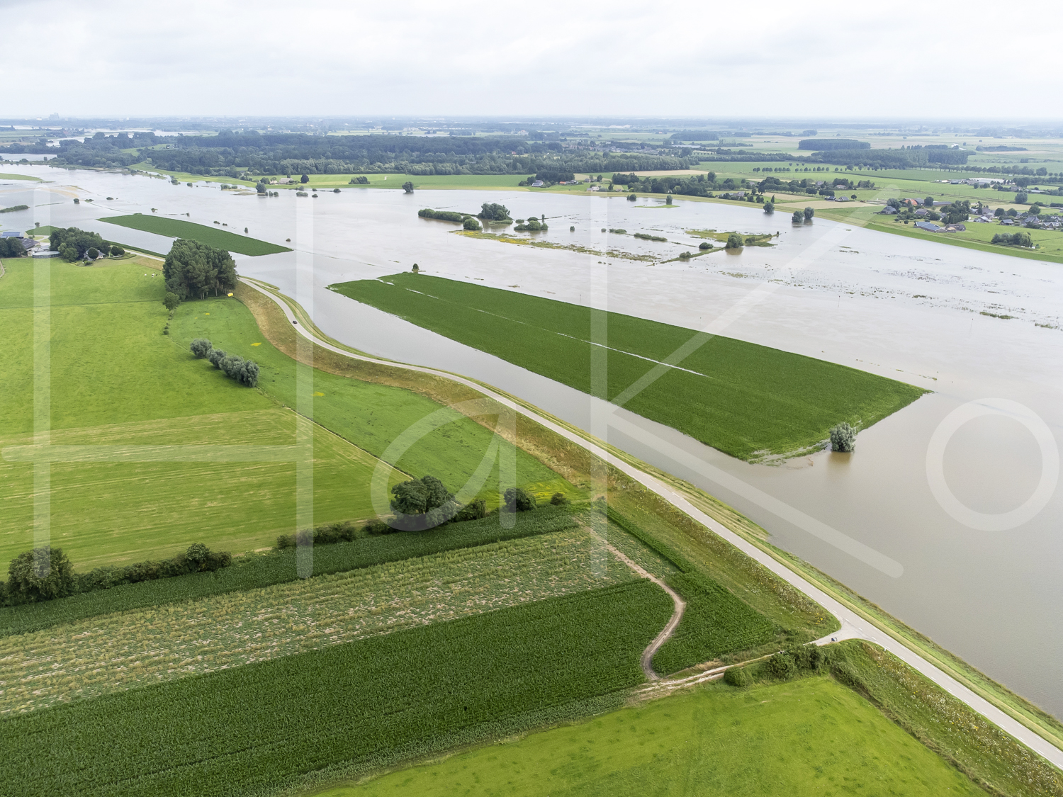 Landbouw vanuit de lucht, ondergelopen uiterwaarden.