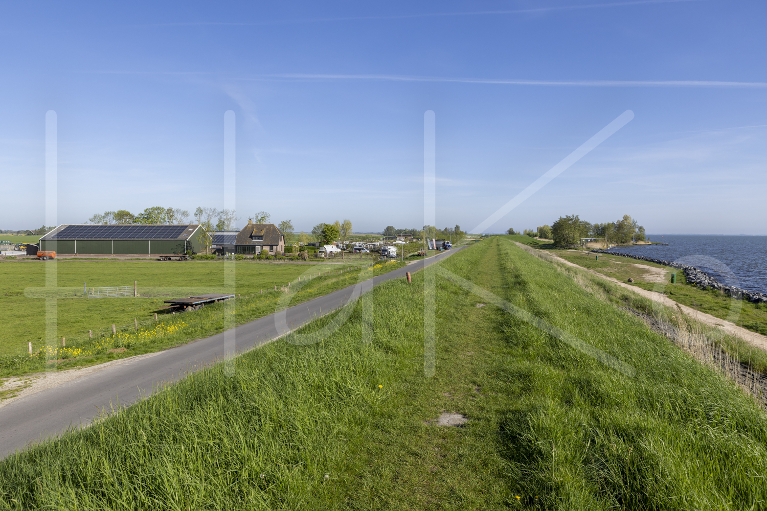 Landschap met boerencamping langs de dijk.