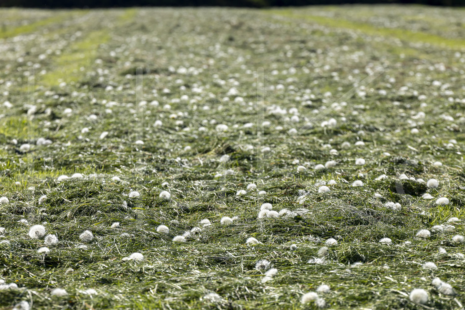 Gemaaid gras met pluizenbollen van de paardenbloem.